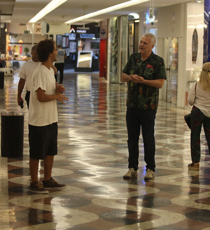 Em flagra raro, Pedro Bial é visto passeando no shopping ao lado do filho, Theo