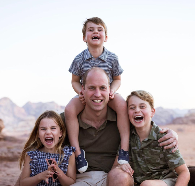 A foto, feita no começo de 2021 quando a família viajou para a Jordânia, conta com a presença do casal e de seus três filhos, o príncipe George, de oito anos de idade, a princesa Charlotte, de seis anos, e o caçula, príncipe Louis, de três aninhos.