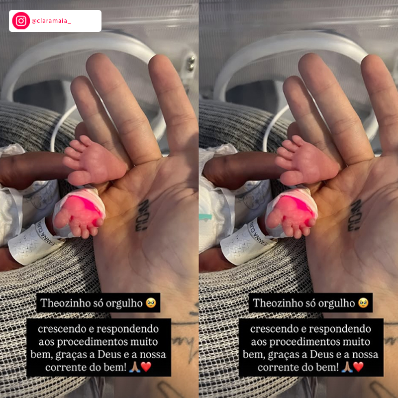 No dia 21 de setembro de 2025, Clara Maia e André Coelho compartilharam com os fãs uma notícia bastante dolorosa. A influenciadora, que estava esperando os gêmeos Túlio e Theo, precisou passar por um parto de emergência, que fez um dos bebês, Túlio, acabar não resistindo devido à prematuridade. Já Theo, segue lutando bravamente pela vida na UTI. A causa do parto antecipado se deu por conta da síndrome da transfusão feto-fetal, uma condição grave que afeta gêmeos idênticos que partilham uma placenta, causando um desequilíbrio no fluxo sanguíneo entre eles. No dia 14 de outubro, Clara falou sobre a evolução do pequeno, que está respondendo bem aos procedimentos. Através dos stories, a influenciadora postou um clique dos pés do bebê e falou com alegria sobre ele: Theozinho só orgulho. Crescendo e respondendo aos procedimentos muito bem. Graças a Deus e a nossa corrente do bem!, celebrou ela. Confira a seguir o que mais eles falaram a respeito do filho: