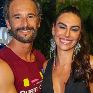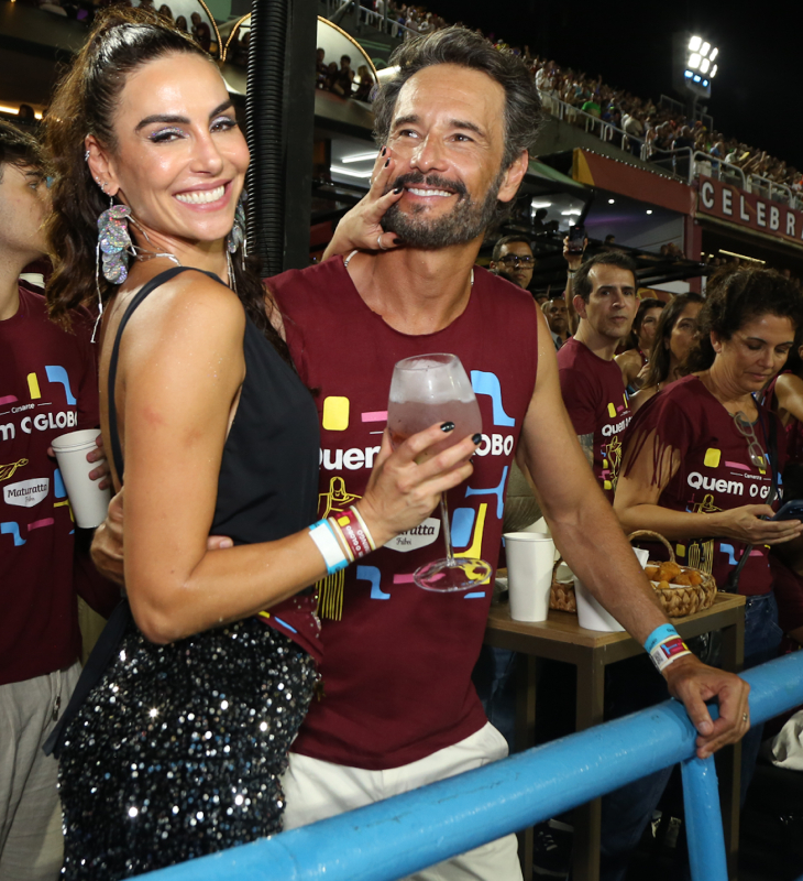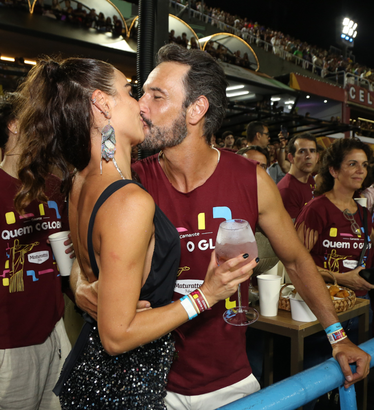 Em aparição rara, Rodrigo Santoro e Mel Fronckowiak trocam carinhos durante desfiles das escolas de samba do Rio de Janeiro; veja