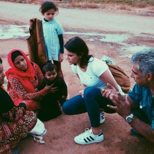 A atriz está viajando e registrando seus momentos com grupos de refugiados