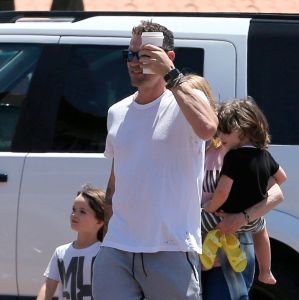 A atriz escolheu um look casual para sair com o marido e os três filhos do casal