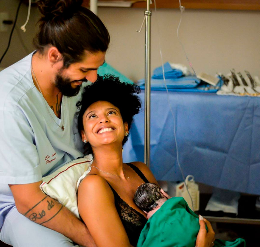 No belo ensaio fotográfico, a atriz não esconde as dores das contrações, mas abre um sorrisão com Benjamin nos braços