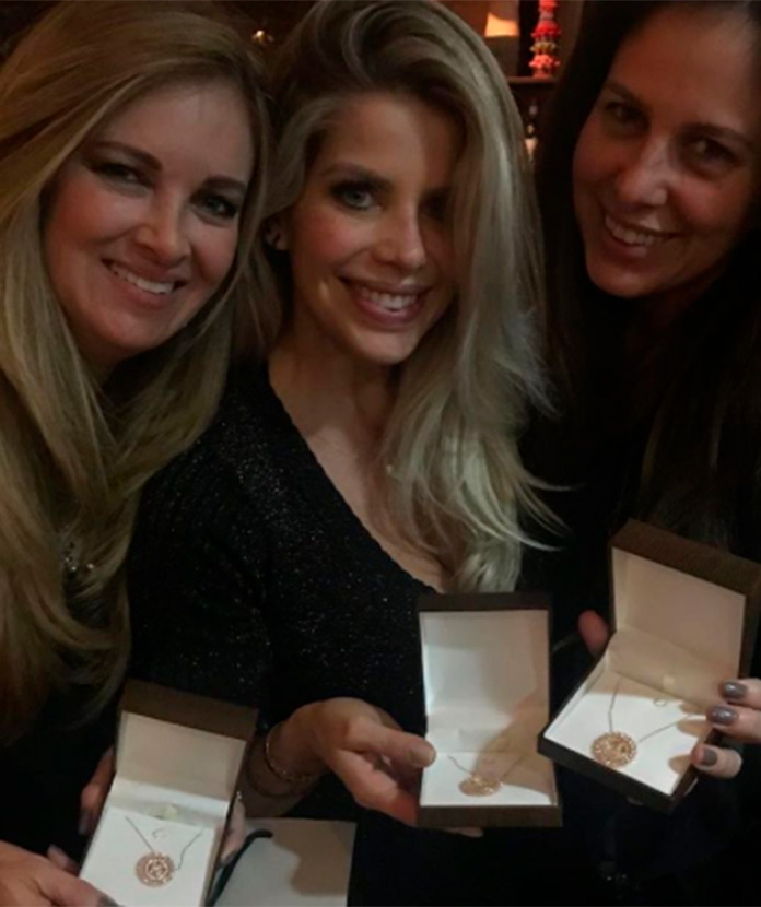 Divulgação Ana Hickmann também deu para cada uma das madrinhas um colar com suas respectivas iniciais. A peça é da própria coleção de joias da modelo e apresentadora. Na foto acima você confere, da esquerda para a direita, Kiki Pinheiro, Karina Bacchi e Jô Pinheiro.