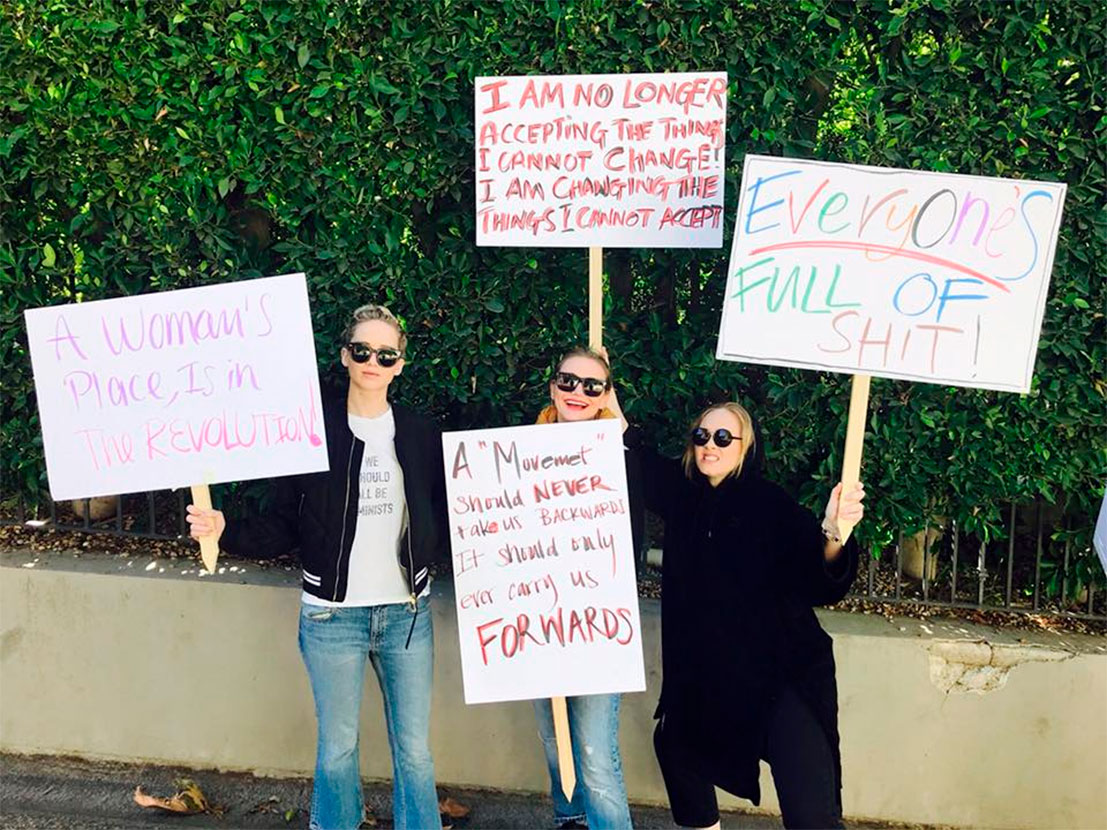 Divulgação No Facebook, Jennifer Lawrence publicou uma foto ao lado de Adele e Cameron Diaz, todas segurando placas empoderadoras como Lugar de mulher é na revolução e Não vou mais aceitar as coisas que não posso mudar! Vou mudar as coisas que não posso aceitar!