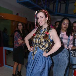 Cantora apostou em um vestido branco curtinho e um buquê de girassóis para curtir o arraiá do Tio Beto no Rio de Janeiro