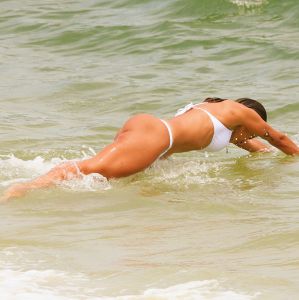 A cantora foi flagrada tomando um banho de mar na Barra da Tijuca