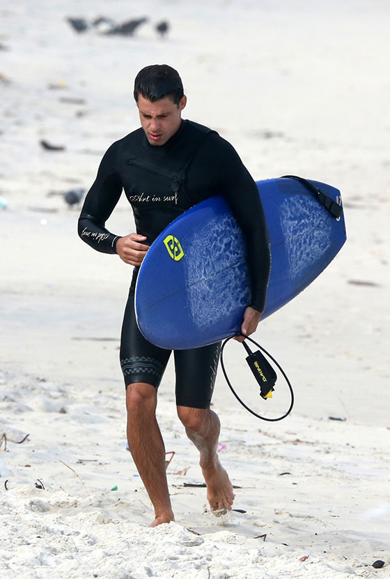 Cauã Reymond exibe tanquinho ao sair de casa para surfar no Rio de Janeiro. Veja as fotos!