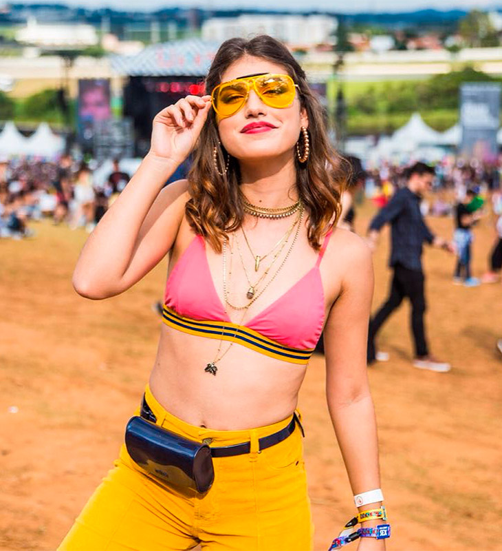 Divulgação Para curtir o Lollapalooza 2018 sem passar calor - e ao mesmo tempo longe de cair em composições óbvias - Giovanna Grigio também apostou no estilo. A atriz combinou uma calça xadrez amarela - estampa que promete aparecer muito nessa temporada - com um sutiã rendado rosa e, para arrematar, bolsa e óculos de sol em tamanhos mini. Juntar peças de estilos opostos - como a calça com pegada mais punk e sutiã romântico - é uma ótima dica para fugir de esteriótipos.