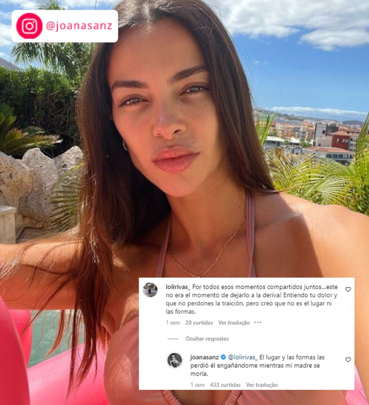Joana Sanz, ex-esposa de Daniel Alves, parece ter perdido de vez a paciência com os fãs do ex-jogador de futebol. Nos comentários de uma de suas fotos, uma seguidora não perdeu a oportunidade de criticar a atitude da modelo de pedir o divórcio. Por todos os momentos compartilhados juntos, este não era o momento de deixá-lo à deriva! Entendo sua dor e que não perdoe a traição, mas acho que não é o lugar nem a forma, escreveu. Joana, então, decidiu quebrar o silêncio e rebateu: O lugar e a forma ele perdeu me enganando enquanto minha mãe morria. Eita! Vale lembrar que a mãe da modelo morreu no início de 2023 após complicações de um tumor.