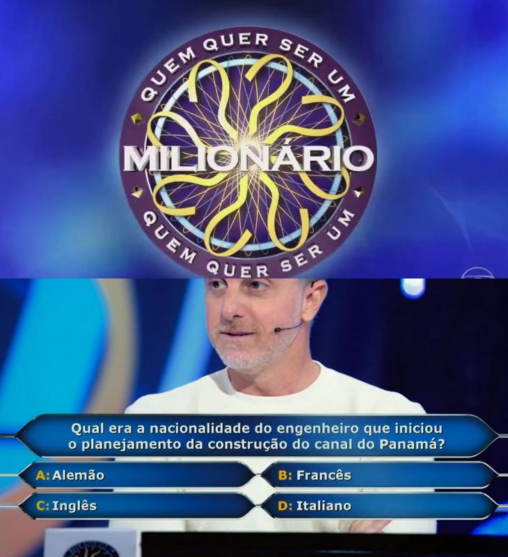 Divulgação-TV Globo Qual era a nacionalidade do engenheiro que iniciou o planejamento da construção do Panamá? A: Alemão. B: Francês. C: Inglês. D: Italiano. Sem pressão, mas essa resposta vale 300 mil reais!