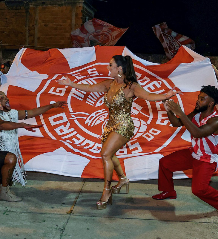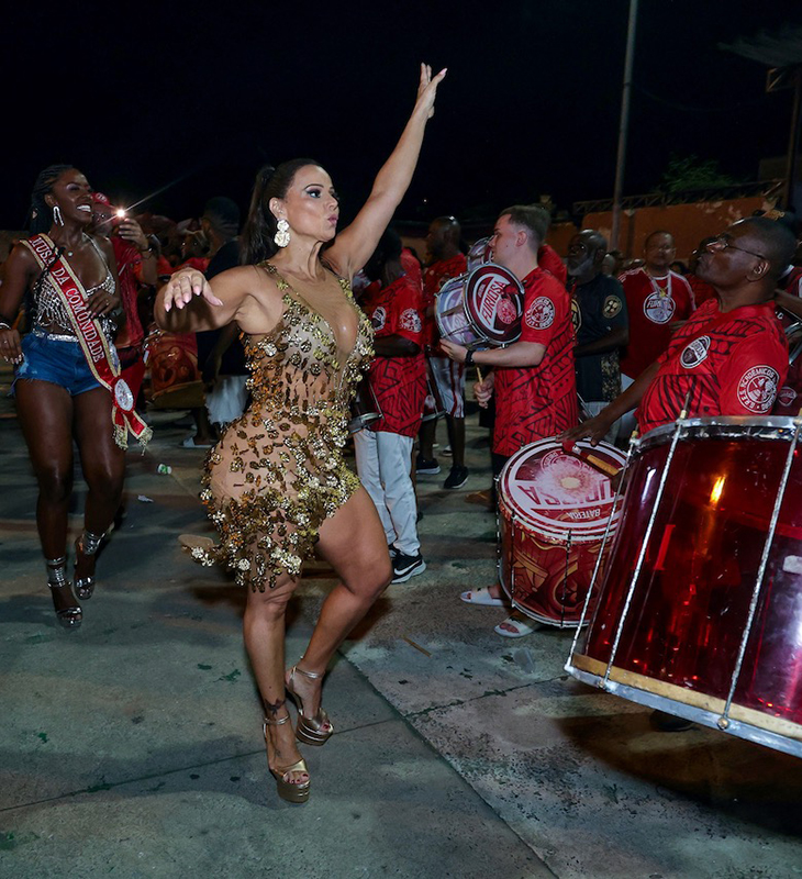 A atriz é Rainha de Bateria da escola de samba carioca