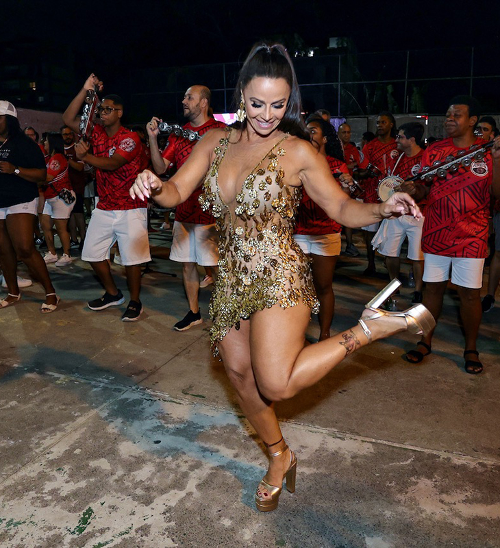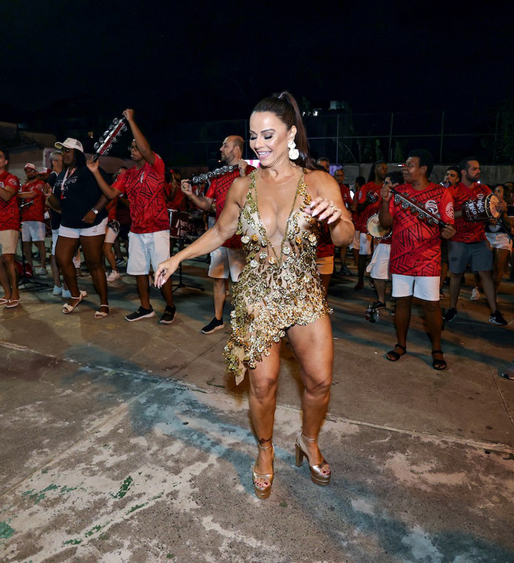 Viviane Araújo toca tamborim e mostra samba no pé em ensaio do Salgueiro; veja fotos!