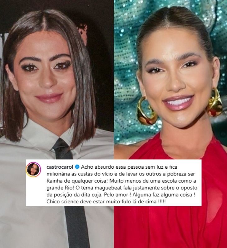 Carol Castro voltou a falar sobre a escolha de Virginia Fonseca como Rainha de Bateria. Em entrevista para a IstoÉ, a atriz explicou o motivo de ter questionado a escolha da escola de samba: - Na mesma semana em que a pessoa estava numa CPI, falando de bets, de jogos, onde você enriquece as custas da perda do outro, lucra em cima da desgraça alheia, que está destruindo famílias, tirando vidas de pessoas [...] E eu fiquei completamente assim: gente, que país é esse que a pessoa está ali, tirando selfie, tirando sarro, rindo, falando tudo o que o advogado falou que tem que falar e, sei lá, três dias depois, vai ser rainha da bateria de um samba-enredo [sobre desigualdade]. Se fosse outro samba-enredo, eu nem ia ter comentado. É uma hipocrisia muito louca Ela também aproveitou para explicar que não gostaria de assumir o posto: - Não, gente, não, eu não tenho nem joelho para isso agora. Adoro carnaval, sambar, etc., mas sair, inclusive, pensando em, na época, deveria ser alguém da comunidade.