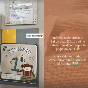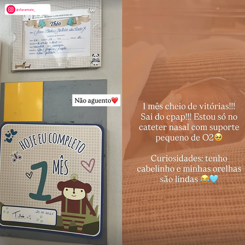 No dia 21 de setembro de 2025, Clara Maia e André Coelho compartilharam com os fãs uma notícia bastante dolorosa. A influenciadora, que estava esperando os gêmeos Túlio e Theo, precisou passar por um parto de emergência, que fez um dos bebês, Túlio, acabar não resistindo devido à prematuridade. Já Theo, segue lutando bravamente pela vida na UTI. A causa do parto antecipado se deu por conta da síndrome da transfusão feto-fetal, uma condição grave que afeta gêmeos idênticos que partilham uma placenta, causando um desequilíbrio no fluxo sanguíneo entre eles. No dia 20 de outubro, Clara celebrou com alegria o primeiro mês de Théo. Com uma foto do rostinho do herdeiro, ela contou que ele está usando apenas um suporte para auxiliar a respiração: Um mês cheio de vitórias!!! Sai do cpap!!!! Estou só no cateter nasal com suporte pequeno de O2, disse ela, que em seguida comentou duas curiosidades sobre o bebê: Tenho cabelinho e minhas orelhas são lindas. Confira a seguir o que mais eles falaram a respeito do filho: