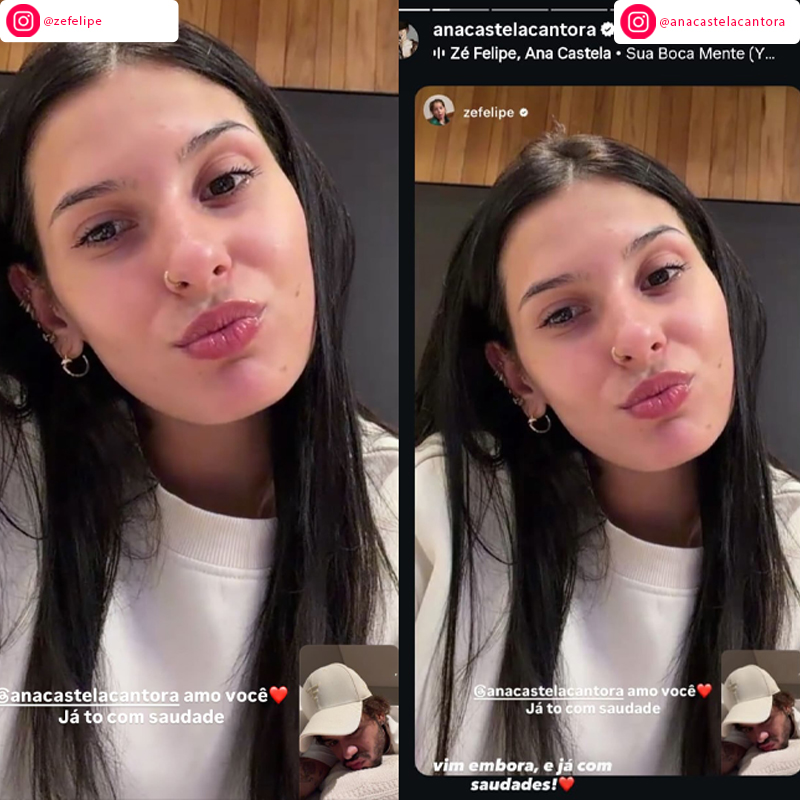 Eita saudade! Após passarem alguns dias juntos na fazenda de Ana Castela, Zé Felipe voltou para Goiânia, enquanto a boiadeira foi para sua casa, localizada em Londrina. Através das redes sociais, os dois lamentaram a saudade e compartilharam registros de uma chamada de vídeo. O filho do cantor Leonardo escreveu: Ana Castela amo você. Já tô com saudade. Ao compartilhar a publicação do namorado, Ana escreveu: Vim embora e já com saudades. Fofos!