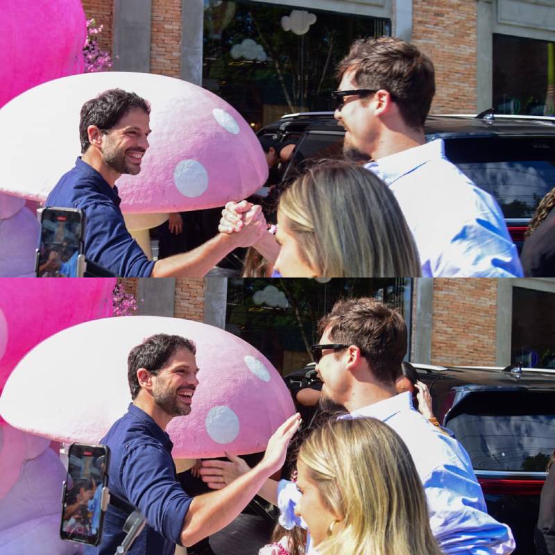 Duda Nagle, pai de Zoe e o atual marido da apresentadora, Nicolas Prattes se cumprimentaram ao chegarem ao evento