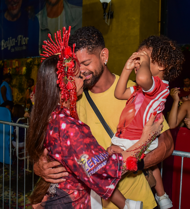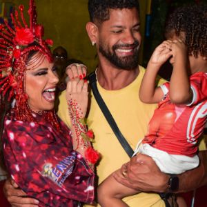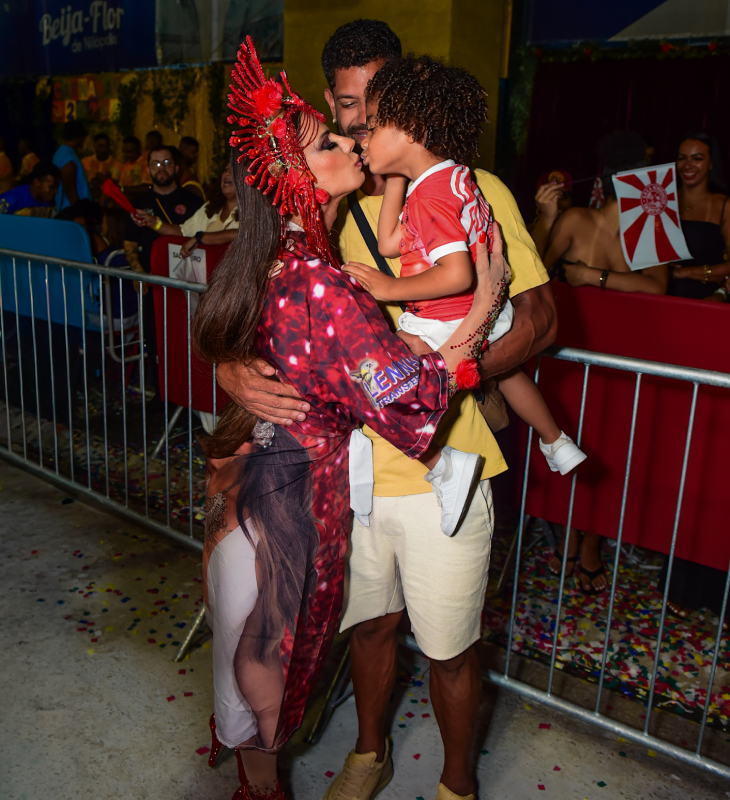 Acompanhada de marido e filho, Viviane Araújo brilha no minidesfile do Salgueiro