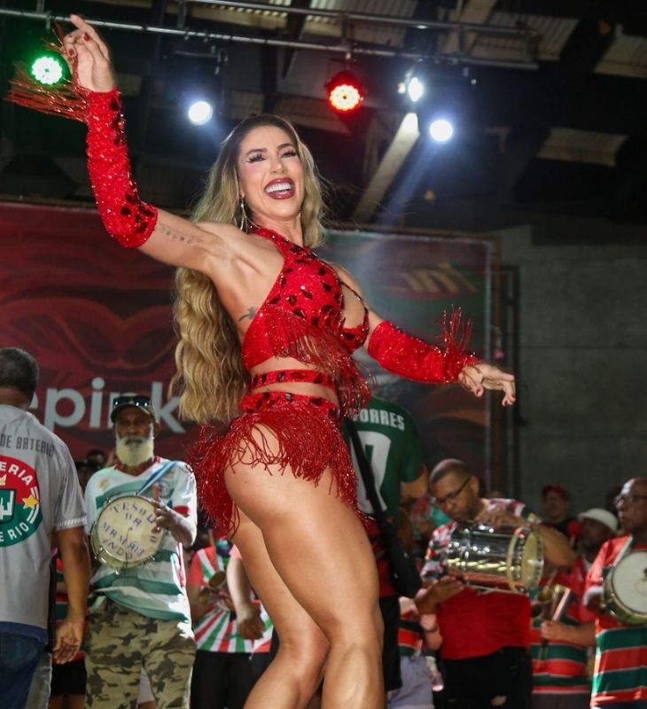 Virginia Fonseca se joga no samba e dá abraço apertado em Brunna Gonçalves durante ensaio de quadra da Grande Rio