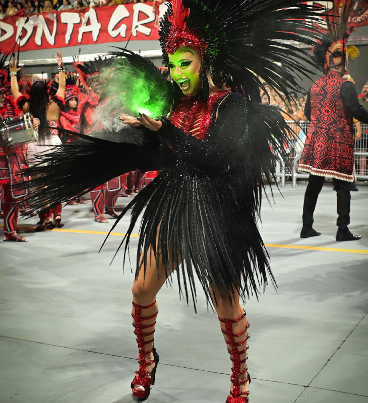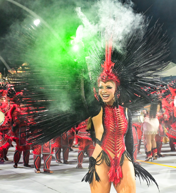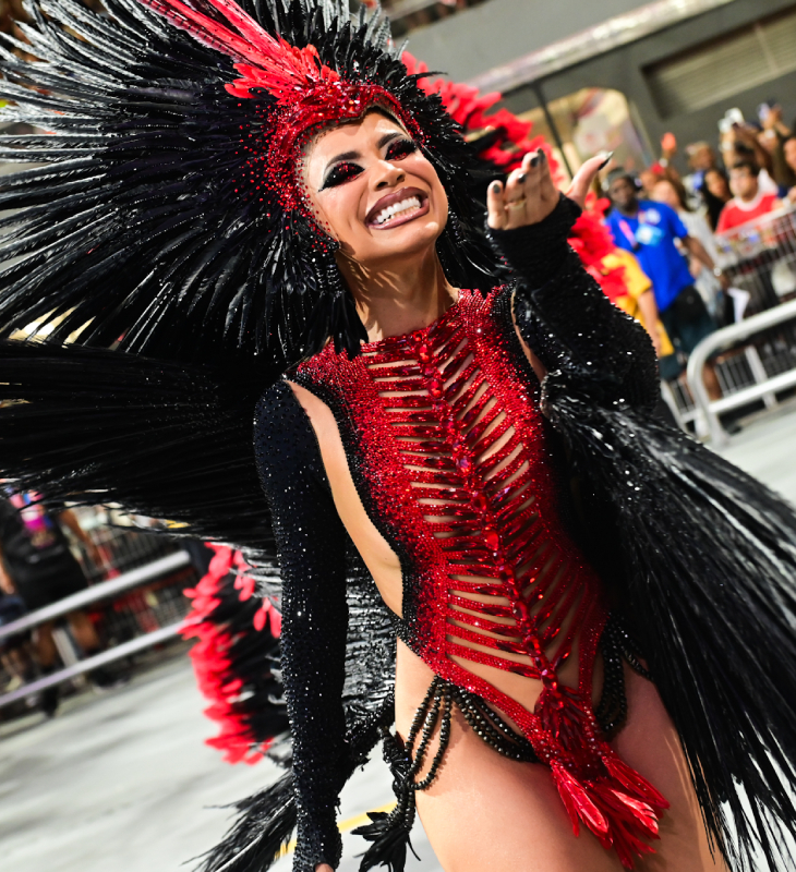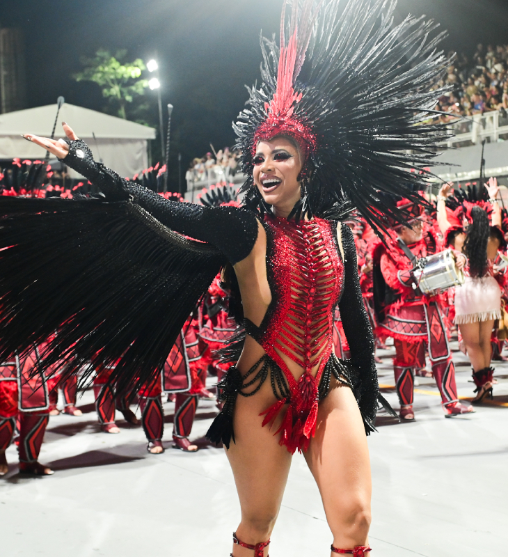 A cantora desfilou na madrugada deste sábado, dia 14, como Madrinha de Bateria da Dragões da Real