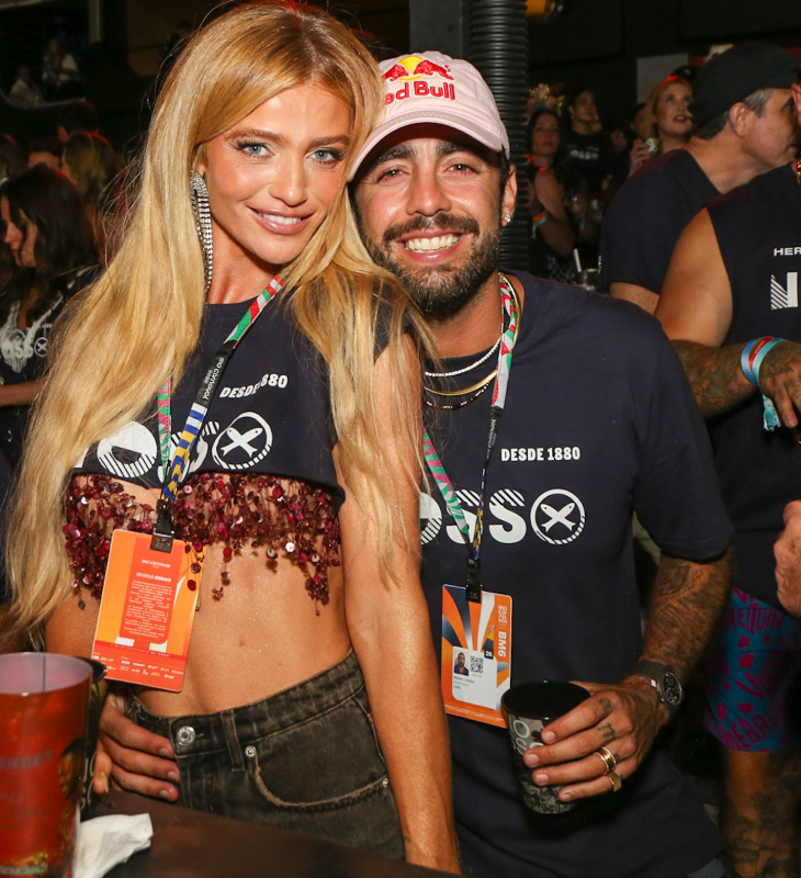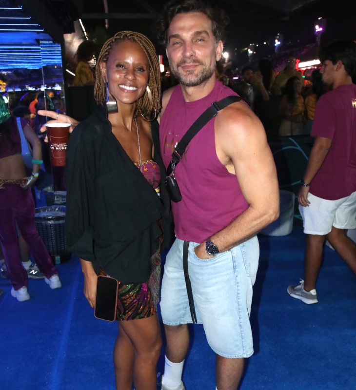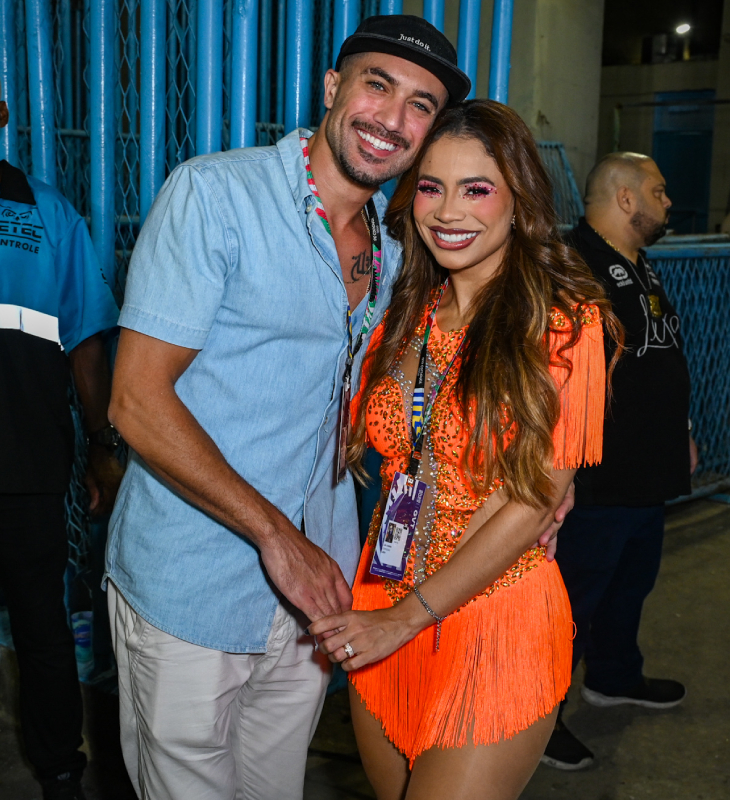 Em aparição rara, Rodrigo Santoro e Mel Fronckowiak trocam carinhos durante desfiles das escolas de samba do Rio de Janeiro; veja