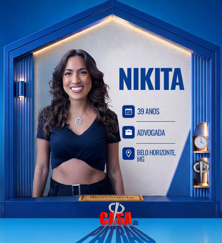 Divulgação-TV Record Nikita tem 39 anos de idade e é advogada em Belo Horizonte - BH. Cresceu em Lagoa da Prata, interior de Minas Gerais. Mudou-se para Belo Horizonte, onde se formou em Direito. Estagiou na Advocacia Geral do Estado e hoje trabalha com Direito da Família. Também trabalha como estrategista digital na ótica da família. Seu objetivo ao entrar no reality é se tornar mãe, de forma independente.