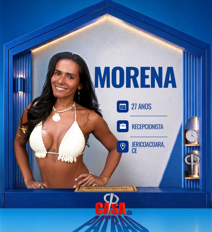 Divulgação-TV Record Morena tem 27 anos de idade e é recepcionista em Jericoacoara - Ceará. Nasceu em Varjota, interior do Ceará, e aos 18 anos, saiu de casa em busca de independência. Trabalha como recepcionista de uma pousada em Jericoacoara (CE) e também divulga festas badaladas da região. Adora surfar e praticar altinha na praia.