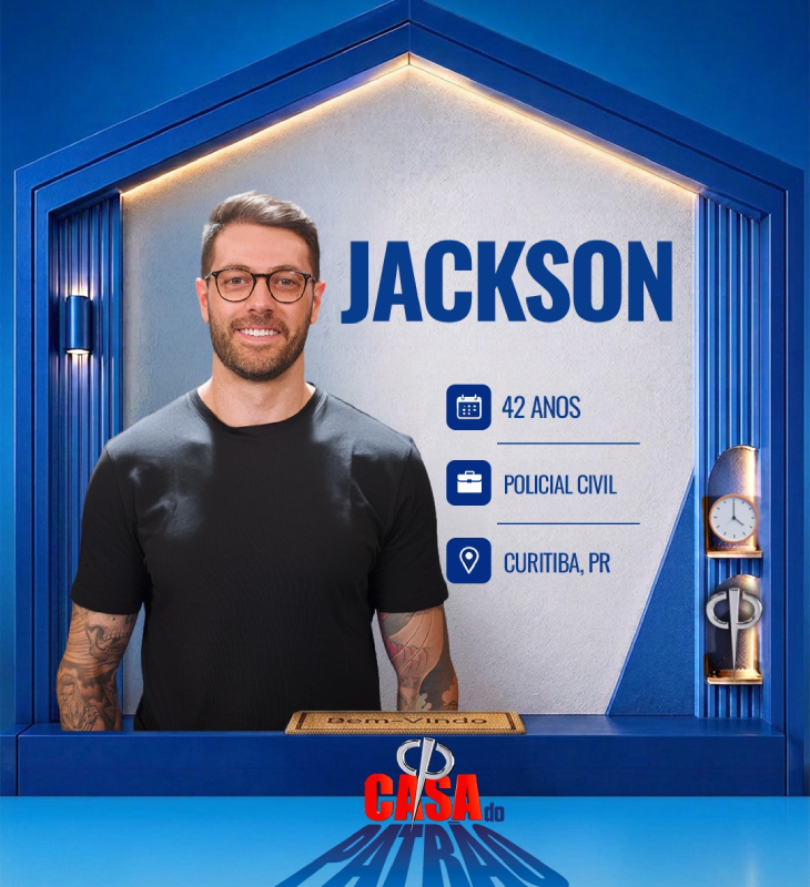 Divulgação-TV Record Jackson tem 42 anos de idade e é Policial Civil em Curitiba - PR - há 15 anos. Na infância, teve uma criação rígida por parte do pai, que era militar. Diz que adora a vida de solteiro e usa os aplicativos de relacionamento para conhecer mulheres.