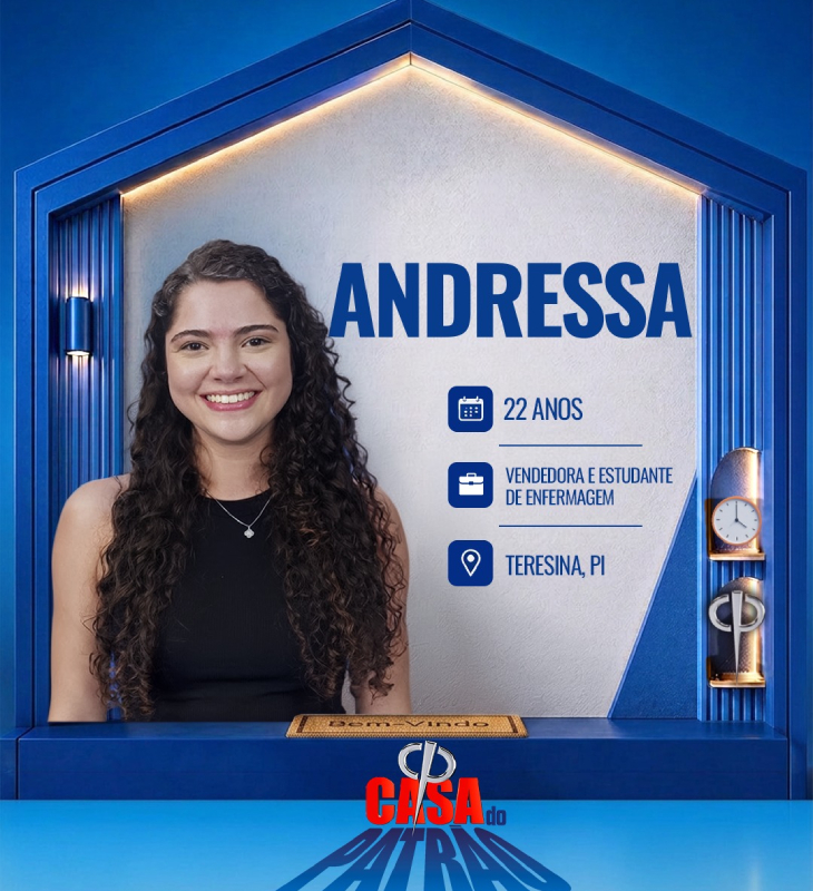 Divulgação-TV Record Andressa é vendedora e estudante de enfermagem e tem 22 anos de idade. Em busca de mais oportunidades, saiu de Teresina (PI) para Canoas (RS). Filha de pai caminhoneiro e mãe empregada doméstica, é bolsista integral do curso de Enfermagem. Adora jogar videogame, mas dança é sua grande paixão e, graças ao talento, participou de campeonatos de dança regional.