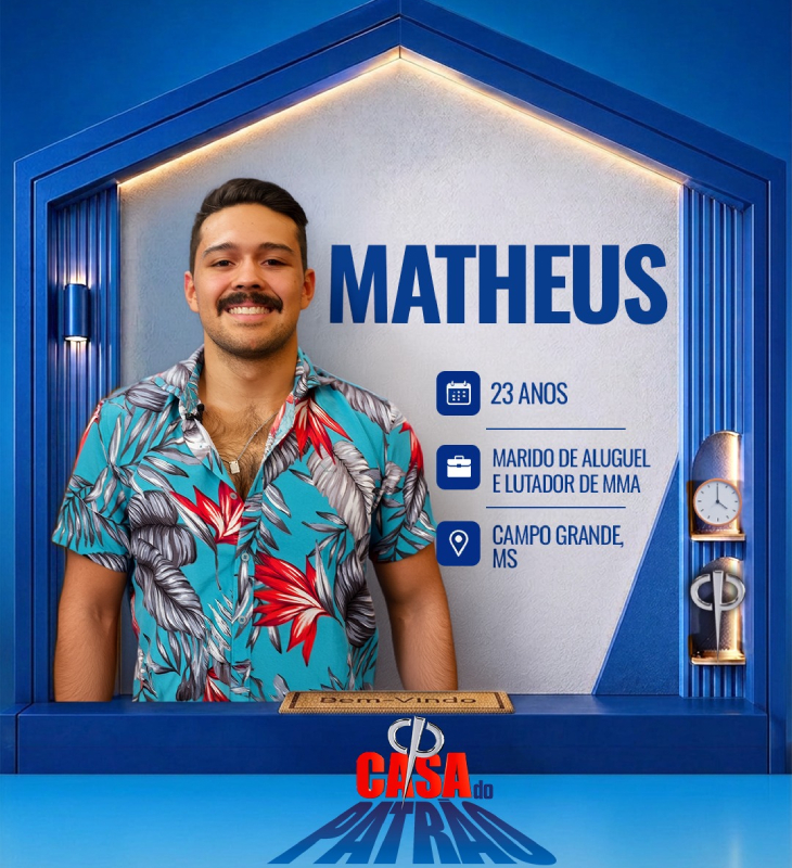 Divulgação-TV Record Matheus tem 23 anos de idade e é marido de aluguel e lutador de MMA, vindo de Campo Grande - MS. Lutador profissional de MMA, na categoria meio-médio, também atua como professor de Muay Thai e Jiu-Jitsu. Como ainda não consegue viver exclusivamente da luta, trabalha como marido de aluguel, um ‘faz-tudo’ de coisas em casa. Filho de pais separados, foi criado pelos avós e saiu de casa aos 16 anos. Trabalha desde cedo, começou no comércio de aviamentos da famíliaSobre: Lutador profissional de MMA, na categoria meio-médio, também atua como professor de Muay Thai e Jiu-Jitsu. Como ainda não consegue viver exclusivamente da luta, trabalha como marido de aluguel, um ‘faz-tudo’ de coisas em casa. Filho de pais separados, foi criado pelos avós e saiu de casa aos 16 anos. Trabalha desde cedo, começou no comércio de aviamentos da família.