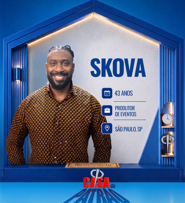 Divulgação-TV Record Skova tem 43 anos de idade, sendo um produtor de eventos de São Paulo - SP. Nascido na Zona Leste de SP, perdeu o pai aos 8 anos, e foi criado pela mãe, que sustentou a família com quatro filhos. Ama samba e pagode. Atualmente, trabalha como produtor de eventos em geral, como shows, aniversários e casamentos. Está solteiro e é pai de um menino de 3 anos. Também trabalha como massoterapeuta, embora não seja seu principal sustento.