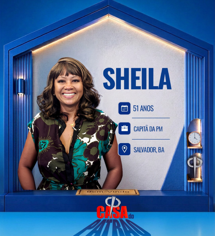 Divulgação-TV Record Sheila tem 51 anos de idade e é capitã da PM de Salvador - BA. Policial militar há 22 anos, é conhecida por ser uma profissional que escuta e acolhe. Foi professora de Matemática por 12 anos e também se formou em Psicologia.