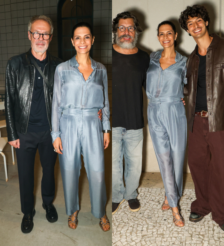Atuando ao lado do filho, Helena Ranaldi posa com ex e atual em pré-estreia de peça