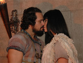 Pois o clima vai esquentar logo no segundo dia de exibição da história, na quinta-feira, dia 4. Dalfom (Gabriel Gracindo) e Tafnes (Lana Rodes) se encontram secretamente nos corredores do palácio e se beijam. A atitude dos dois é arriscada, já que Tafnes faz parte do harém do rei Assuero e pode ser morta caso o personagem de Marcos Pitombo saiba sobre o envolvimento.