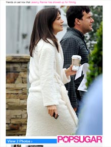 De roupão, Katie Holmes foi fotografada na terça-feira, dia 12, nos bastidores da locação onde é filmada a comédia Jack and Jill, que tem também Adam Sandler como protagonista. Os trabalhos estão sendo realizados em Los Angeles.