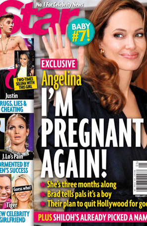 - Angelina está evitando a mídia porque ela não quer que ninguém saiba que ela está grávida. Ela já sofreu um pouco de enjoo matinal e não queria chamar atenção para ela em público, contou uma fonte para a revista.