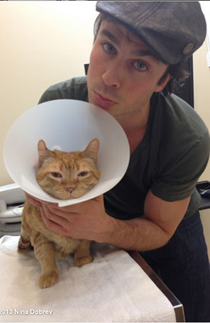 Além de postar uma foto do bichano deitado coberto por seu casaco e com um colar que o impedia de se lamber ela também mostrou que Ian Somerhalder não saiu do lado do bichinho, até fazendo bico para a foto, como você pode ver ao lado.