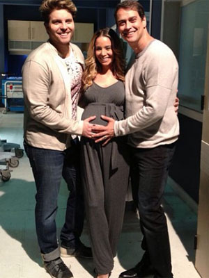 Nesta segunda-feira, dia 23, Amaury Nunes publicou uma foto no Instagram em que mostra a namorada Danielle Winits grávida e acompanhada por dois colegas de elenco.