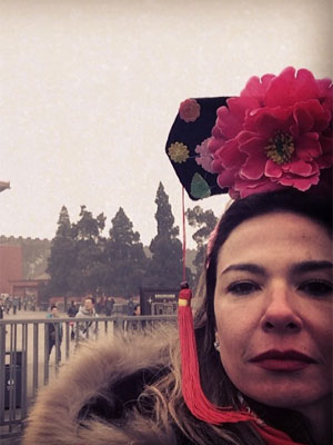 Luciana Gimenez posa com chapéu típico durante passagem pela China