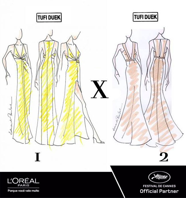 Os modelos na disputa, que você pode ver na imagem acima, pertencem a grife Tufi Duek, sendo o primeiro modelo de estrutura recortada com decote e fenda na cor amarela, e o segundo de estrutura sereia de tom nude.