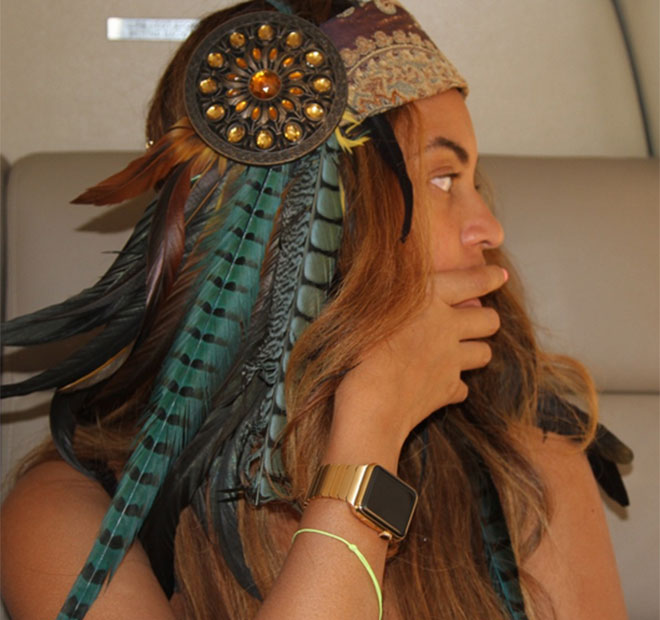 Beyoncé uniu o tradicional e o tecnológico em sua ida ao Coachella. Ela usou na cabeça um cocar, na mão o celular e no pulso, um smartwatch, relógio que interage com o telefone.