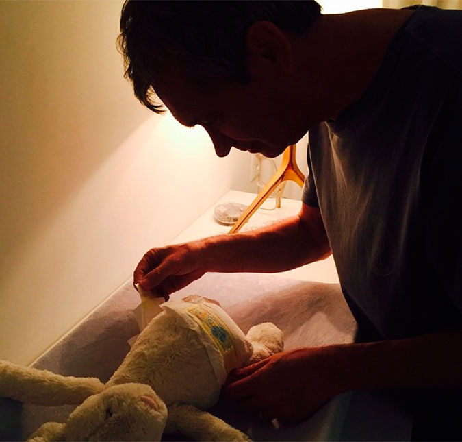 Na foto, Serginho aparece trocando a fralda de um ursinho de pelúcia identificando a cena na legenda como: Treinamento de fraldas.Groisman, aos 64 anos, revelou, há alguns meses, que vai ser pai pela primeira vez.