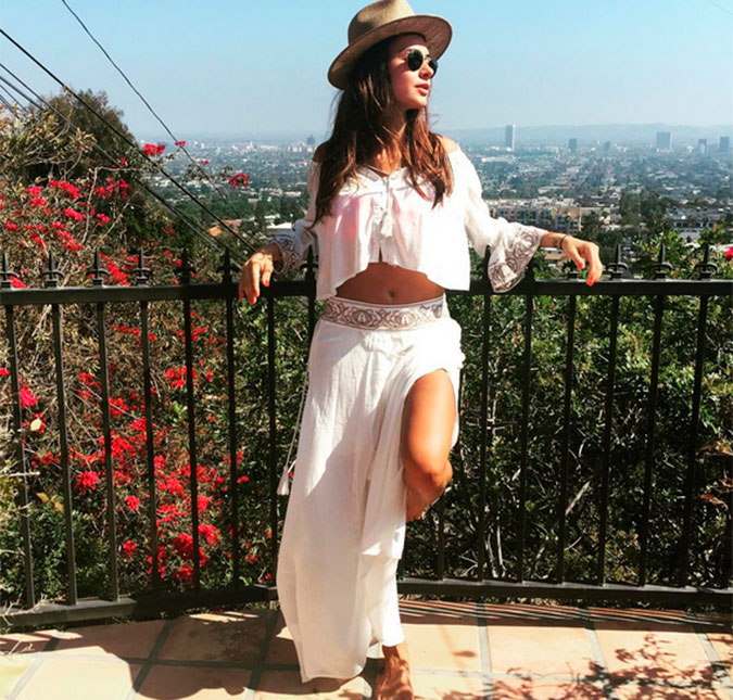 A modelo, conhecida por sua boa forma, gosta de mostrar o corpo e aproveitou o verão do hemisfério norte, já que está morando em Los Angeles, para deixar a barriguinha de fora no look descontraído.