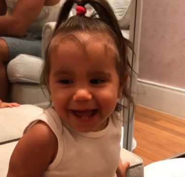 Deborah postou dois vídeos em seu Instagram. No primeiro, Maria aparece dando gargalhadas, enquanto os pais brincam com ela, e, no segundo, a pequena fala a palavra beba.
