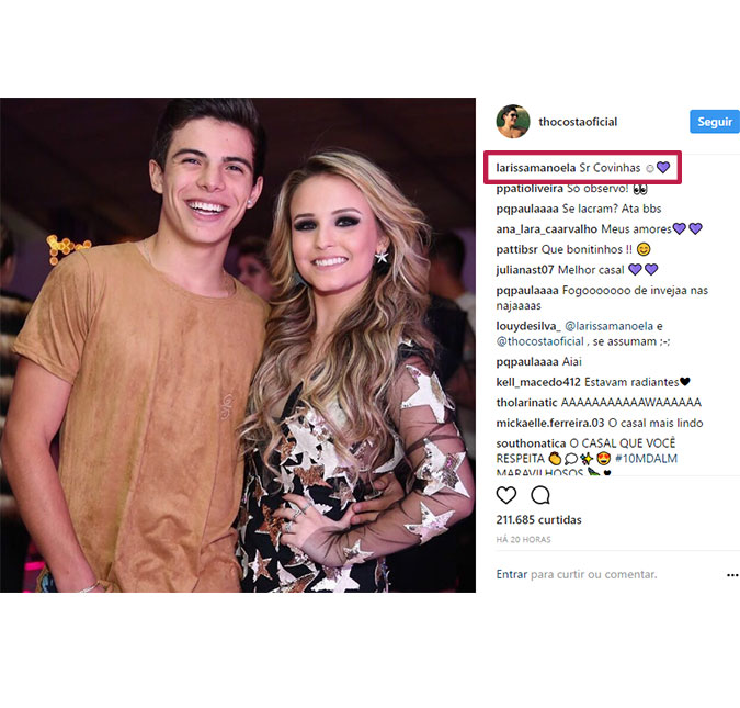 Na última quarta-feira, dia 28, o Thomaz compartilhou no Instagram uma foto em que aparece ao lado da estrela de Meus 15 Anos. Na legenda, ele usou a hashtag 10MdaLari, referindo-se aos dez milhões de seguidores que a atriz conquistou nas redes sociais, mas o mais bonitinho mesmo foi o comentário que Lari deixou na publicação: Senhor Covinhas, seguido de um coraçãozinho. Será que esse é o apelido carinhoso que ela usa?