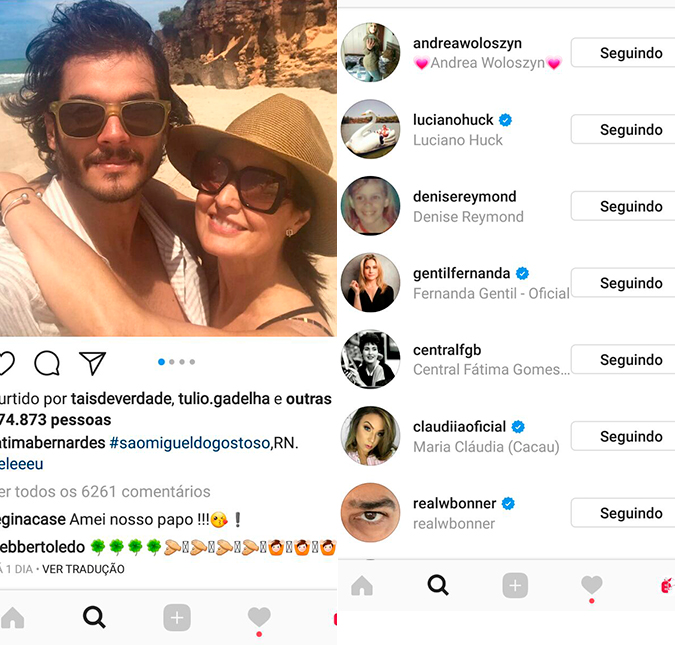 Para comprovar que o jornalista realmente deu um like no clique é fácil. Basta ir até o perfil de Fátima na rede social e clicar em cima da foto acima, em que ela e Túlio aparecem abraçados em uma selfie na praia. Na parte de curtidas é possível encontrar o perfil de Bonner como um dos seguidores de Fátima Bernardes que deixou um coraçãozinho no post.
