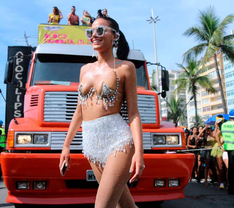 Ao desfilar no Bloco da Favorita o que chamou atenção foi o look escolhido pela atriz. Com um microtop cheio de brilho e pedrarias, ela exibiu o corpão e caiu no samba. A imprensa internacional amou e não poupou elogios.