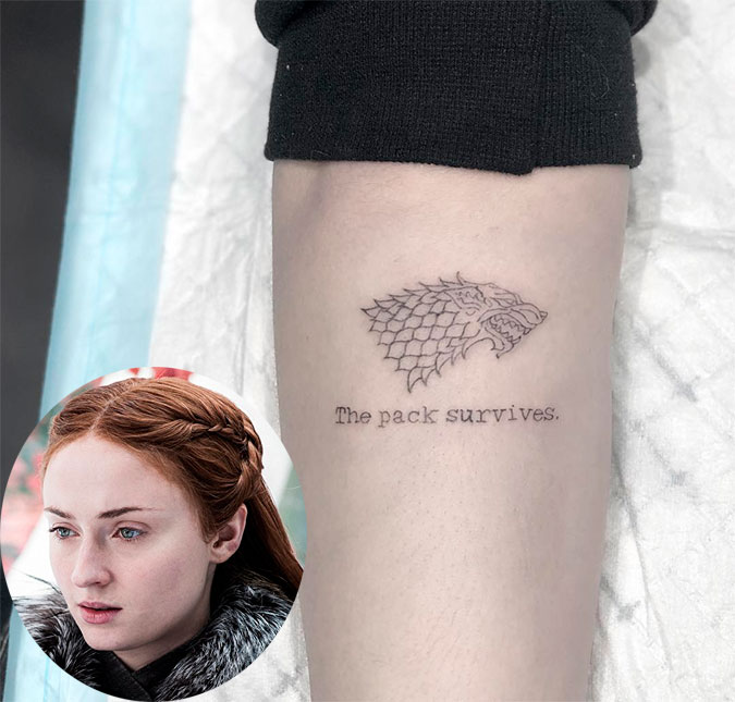 A tatuagem, que você vê acima, mostra o símbolo da família Stark junto com a frase O bando sobrevive. Isso significaria, de acordo com alguns fãs, que Jon, Sansa, Bran e Aria estariam todos vivos no final da trama.