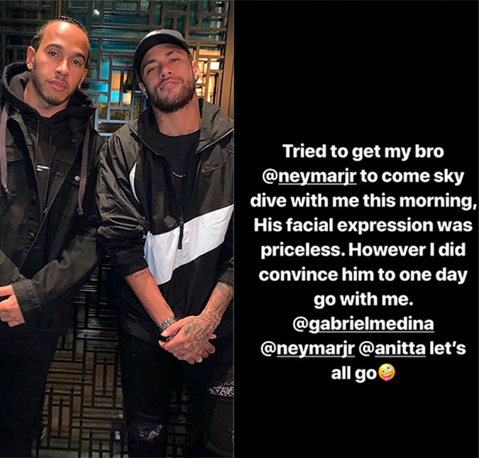 Parece que tem mais alguém querendo entrar para a panelinha de Anitta, Neymar e Gabriel Medina! Lewis Hamilton, fez um convite ao trio nos Stories de seu Instagram. O piloto de Fórmula 1 contou que chamou o jogador do Paris Saint Germain para pular de paraquedas, mas o craque não gostou muito da ideia: