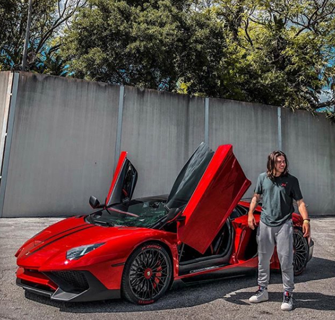 O comediante posou em frente a uma belíssima Lamborghini vermelha em que as portas abrem até para cima e como de costume, tirou a maior onda e fez muita piada com a dificuldade que teve ao sair do automóvel.